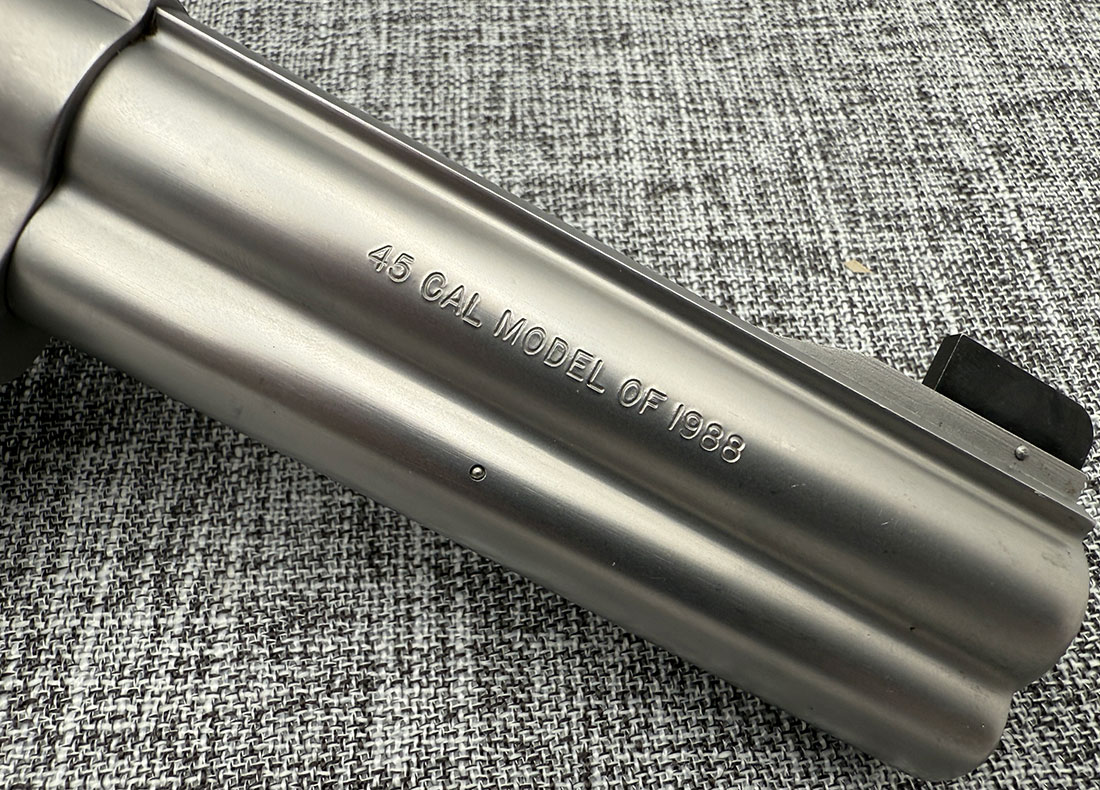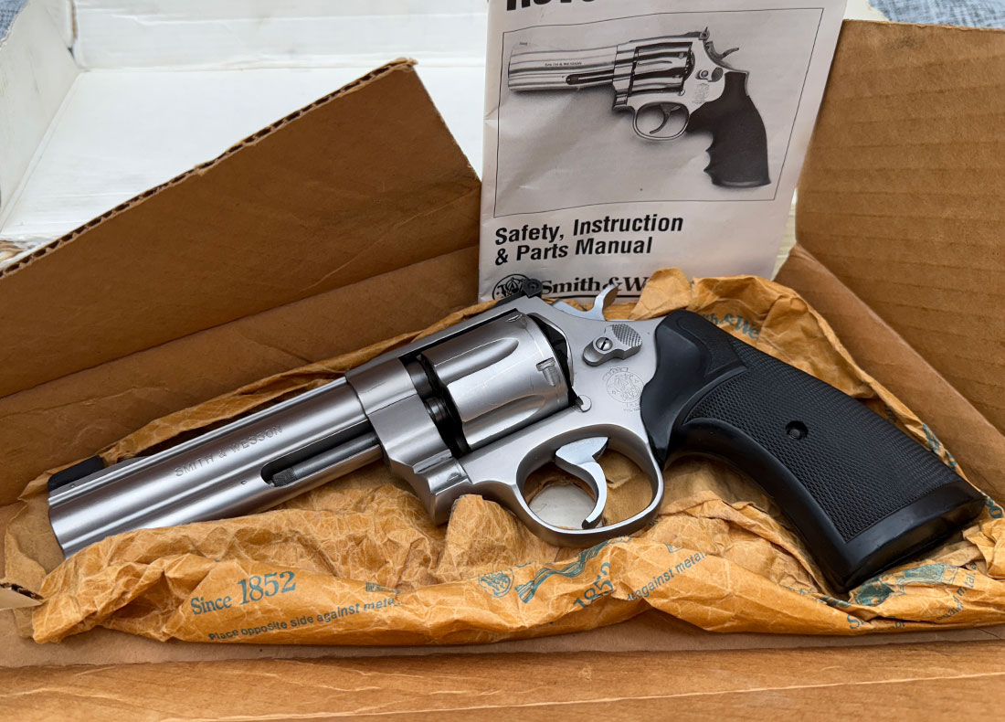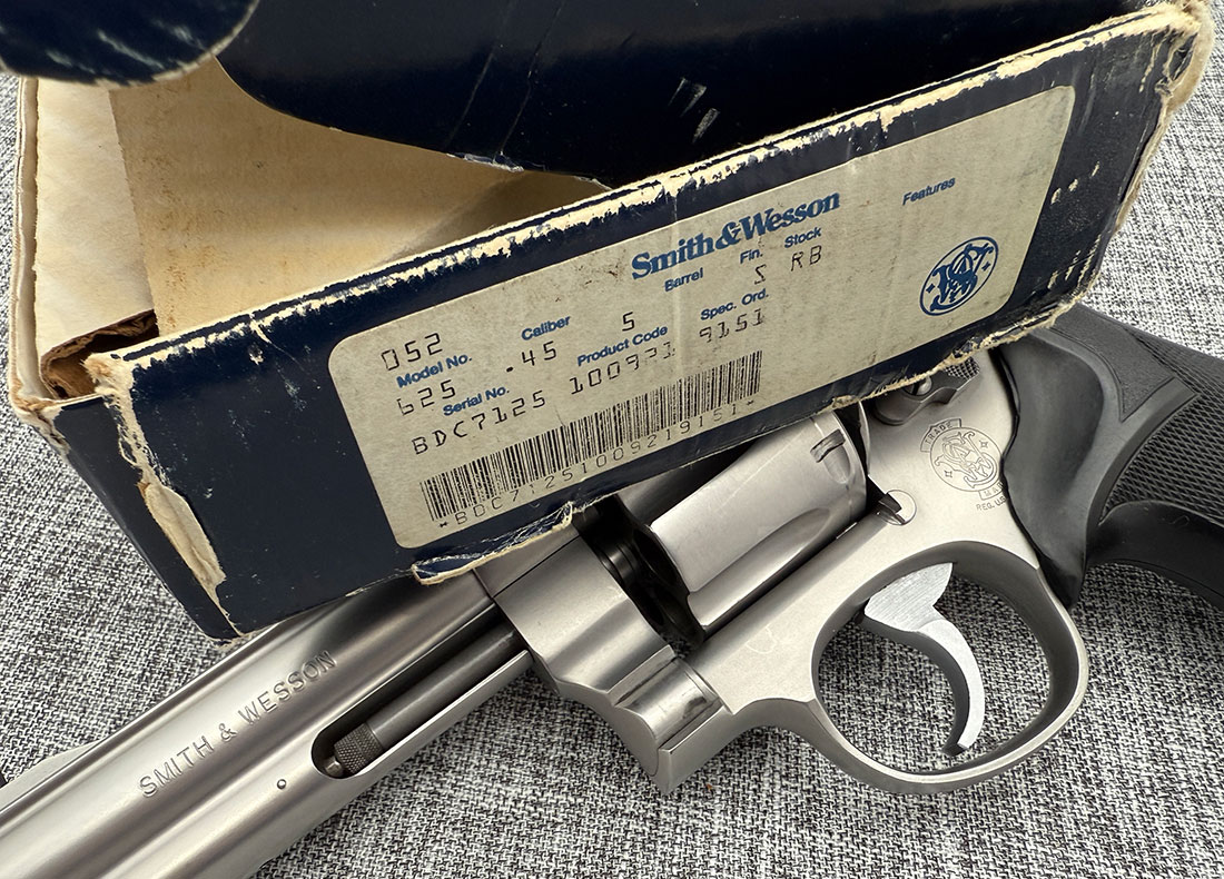 Very Good Condition Smith & Wesson 625-2 Model of 1988 chambered in .45 Caliber. This rare 6-shot revolver features 5″ barrel, rubber grips and comes with original cardboard box and manual. Below are the actual photos of the gun.