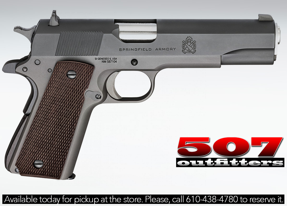 New Springfield Armory 1911 Mil-Spec chambered in .45 ACP. It features Parkerized Finish and comes with one 8-round magazine. Available at 507 Outfitters in Easton, PA. We carry wide selection of Springfield Armory firearms. Contact us for pricing and availability at contact@507outfitters.com, call us at 610-438-4780, or chat with us on WhatsApp by clicking in the bottom right corner.